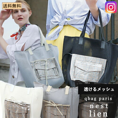 【在庫限り】qbag paris nest ネスト lien リヤン 外ポケット付き チェック柄 透ける メッシュバッグ 大容量 マザーズバッグ ママバッグ レディースバッグ トート 通勤 スポーツ ジム 洗える 送料無料 ギフト プレゼント 送料無料