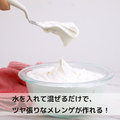 小さじ2杯のメレンゲパウダーに大さじ2杯の水を加えて泡立てれば、卵白1個分のメレンゲが出来上がります。