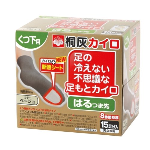 ブランド:足の冷えない不思議な足もとカイロ製造販売元 桐灰化学内容量:30個 (15足分)カラー:ベージュJANコード: 4901548162952「足の冷えない不思議な足もとカイロ はるつま先 ベージュ 15足分」は、くつの中専用として温度調節された、くつ下に貼るカイロです。
