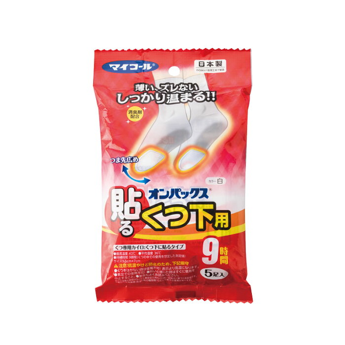 つま先の曲線に程よくフィット!靴下に貼る5足組最高43度、平均36度●消臭剤配合●持続時間約9H【規格】単品サイズ:95×70mm【成分】鉄粉、水、活性炭、塩類、吸水性樹脂、木粉、バーミキュライト・鉱物系吸着剤※代引き決済不可の商品ですので、お支払い方法にご注意ください。