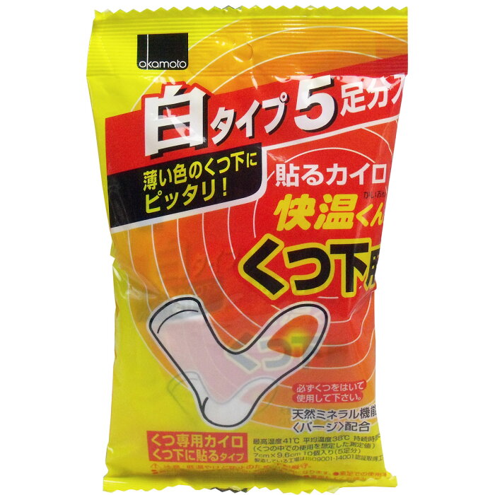 個装サイズ:120X200X40mm個装重量:約140g内容量:5足分入製造国:日本 【 :48】【発売元:オカモト株式会社】くつ専用カイロ!くつ下に貼るタイプ!●最高温度:41度●平均温度:38度●持続時間:5時間(くつの中での使用を想定した測定値)●サイズ:7cm×9.6cm10個入(5足分)【原材料名】 鉄粉、水、活性炭、バーミキュライト、高吸水性樹脂、塩類、天然鉱石粉【使用方法】 (1)使用直前に開封しはくり紙をはがして、もまずに足裏のつま先に、必ずくつ下の上から貼ってご使用ください。