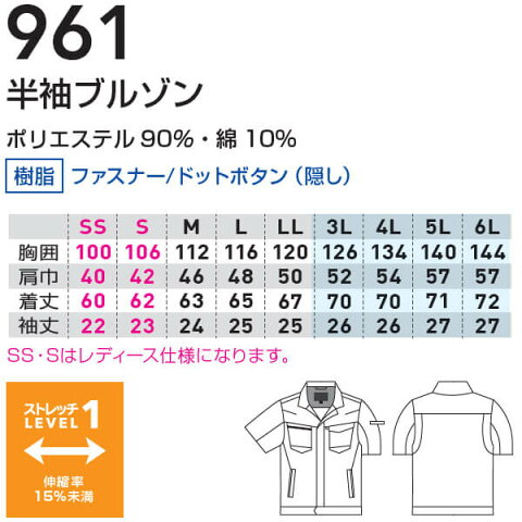 機能説明 信頼の日本製サマー裏綿を使用 窮屈感を感じさせない適度なストレッチ性 レディースサイズ対応商品 生地裏側の肌離れが良くベタつきにくい JIS T8118 規格適合の制電性商品 不快なニオイを軽減するデオドラントテープ付き スペック メーカー 桑和(SOWA) 品番/シリーズ 961 969/961シリーズ シーズン 春夏用 ※このシリーズの秋冬用商品はコチラ 商品名 半袖ブルゾン&スラックスセット(上下同色) 素材 ポリエステル90%・綿10%(裏綿) 機能 二重織、制電性素材、ストレッチ、消臭、イージーケア、レディース対応、野帳ポケット(ブルゾンのみ) カラー 1.ネイビー 4.ブラック 8.ブルー 22.シルバーグレー 87.ライトブラウン 107.モスグリーン 109.ダークグリーン サイズ 半袖ブルゾン:SS-6L スラックス:GS-G3L、70cm-130cm ※3L/91cm-100cm以降は割り高になります。