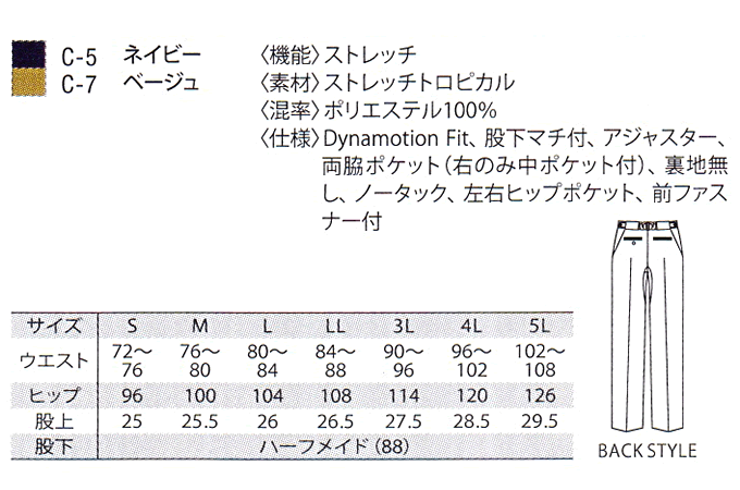 ■商品名:パンツ(男性用)■サイズ展開:S〜5L■カラー展開:ネイビー、ベージュ■素材:ストレッチトロピカル■混率:ポリエステル100%■仕様:Dynamotion Fit、股下マチ付、アジャスター、両脇ポケット(右のみ中ポケット付)、裏地無し、ノータック、左右ヒップポケット、前ファスナー付■機能:ストレッチSize Information S:ウエスト 72~76cm/ヒップ 96cm/股上 25cm/股下 ハーフメイド(88)cm M:ウエスト 76~80cm/ヒップ 100cm/股上 25.5cm/股下 ハーフメイド(88)cm L:ウエスト 80~84cm/ヒップ 104cm/股上 26cm/股下 ハーフメイド(88)cm LL:ウエスト 84~88cm/ヒップ 108cm/股上 26.5cm/股下 ハーフメイド(88)cm 3L:ウエスト 90~96cm/ヒップ 114cm/股上 27.5cm/股下 ハーフメイド(88)cm 4L:ウエスト 96~102cm/ヒップ 120cm/股上 28.5cm/股下 ハーフメイド(88)cm 5L:ウエスト 102~108cm/ヒップ 126cm/股上 29.5cm/股下 ハーフメイド(88)cmunite×MIZUNO 関連アイテムはこちら unite MIZUNO 前ファスナーショートジャケット(女性用)MZ-0105 unite MIZUNO 前ファスナージャケット(男性用)MZ-0106 unite MIZUNO チェスターコート風ドクターコート(女性用)MZ-00107 unite MIZUNO チェスターコート風ドクターコート MZ-00108 unite MIZUNO ウエストアジャスター付パンツ(女性用)MZ-0087 unite MIZUNO ウエストアジャスター付パンツ(男性用)MZ-0088