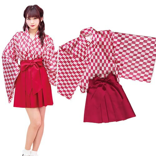 【セット内容】上着、袴風スカート【素材】ポリエステル100%【洗濯表示】洗濯不可、塩素系漂白剤による漂白不可、アイロンは中温で当て布使用、ドライクリーニング不可【パッケージサイズ】中袋 W220×H390mm 【パッケージサイズ】345g【対応サイズ】Ladies/身長155〜165cm、B〜89cm、W〜67cm、H〜96cm【メイン部分の長さ(着丈等)】上着56cm、スカート45cm【開き】上着/サイドリボン、スカート/後ろファスナー【開き】160cm【バスト実寸】108cm【ウエスト実寸】62〜70cm【肩幅実寸】55cm【袖丈実寸】45cm【裏地の有無】無し【必ずご確認ください!】※ビニール開封後の商品は、不良品の場合を除き、返品・交換ができません。